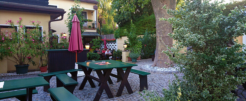 Der schattige Garten bietet 200 Besuchern unter vielen alten Platanen Platz. Die Gäste des Hauses genießen unsere prämierten Bouteillenweine, die auch glasweise gereicht werden.